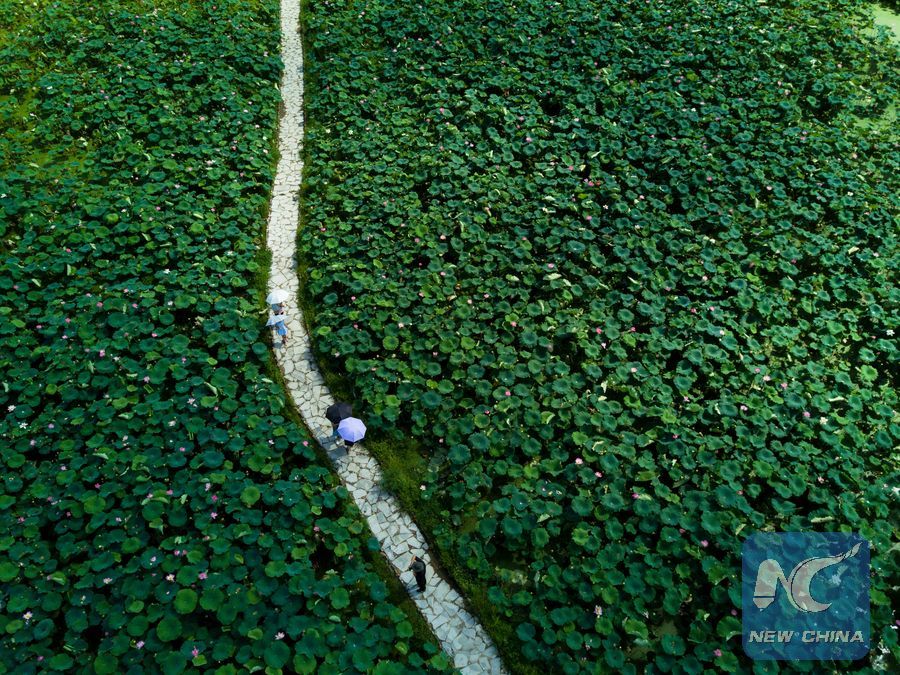 Aerial photo taken on July 8, 2018 shows tourists walking amid lotus flowers at Xiuzhu Village of Jianning County in Sanming City, southeast China's Fujian Province. Located on the southeastern coast of China, Fujian Province is lying between mountains and the sea. Acting on the understanding that lucid waters and lush mountains are invaluable assets, Fujian in recent years has achieved great successes in terms of ecological development.(Xinhua/Song Weiwei)
