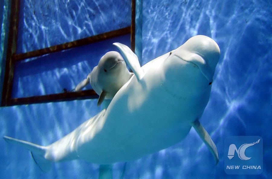 A female white whale and a calf are seen at a breeding base of Chimelong Ocean Kingdom in Zhuhai, south China's Guangdong Province, Jan. 18, 2019. Three white whale calves were born within 13 days in December 2018. (Xinhua/Liu Dawei)