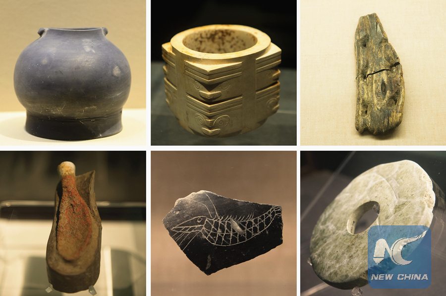 Combo photo shows artifacts excavated from the Liangzhu relic site in Hangzhou, capital of east China's Zhejiang Province. (Xinhua/Weng Xinyang)