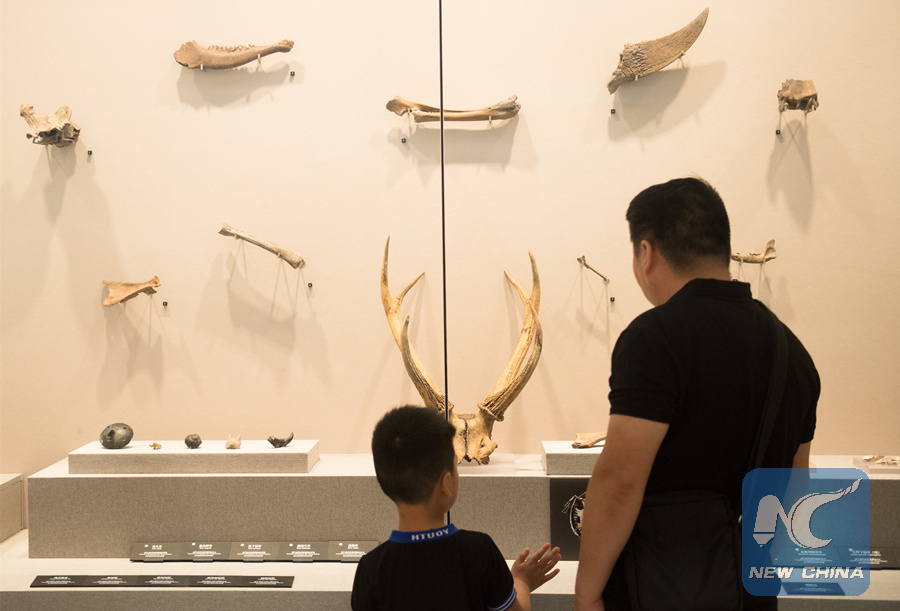 People look at excavated animal bones at Liangzhu Museum in Hangzhou, capital of east China's Zhejiang Province, June 22, 2019. (Xinhua/Weng Xinyang)