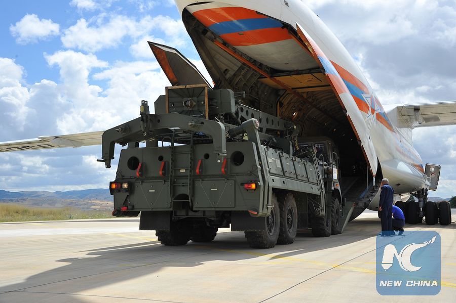 A Russian Antonov military cargo plane, carrying parts of the S-400 missile defense system from Russia, is unloaded after landing at the Murted Air Base in Ankara, Turkey, on July 12, 2019. The first batch of Russian S-400 air defense system was delivered in Turkish capital city of Ankara on Friday, the Turkish Defense Ministry said. (Turkish Defense Ministry/Handout via Xinhua)