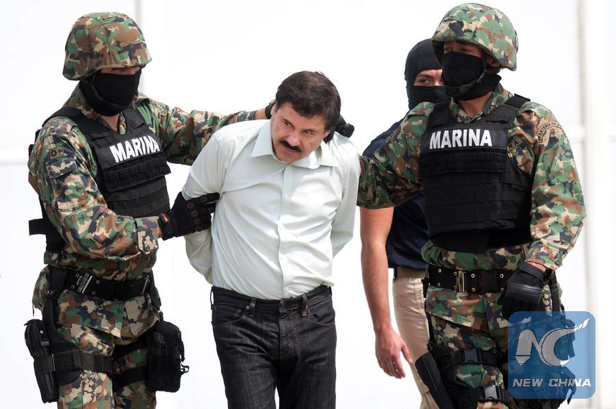 File photo taken on Feb. 22, 2014 shows drug lord Joaquin Guzman Loera, alias "El Chapo", presented to the media in Mexico City, capital of Mexico. The Mexican government announced on Jan. 19, 2017 that Joaquin Guzman Loera was being extradited to the United States. (Xinhua/David de la Paz)