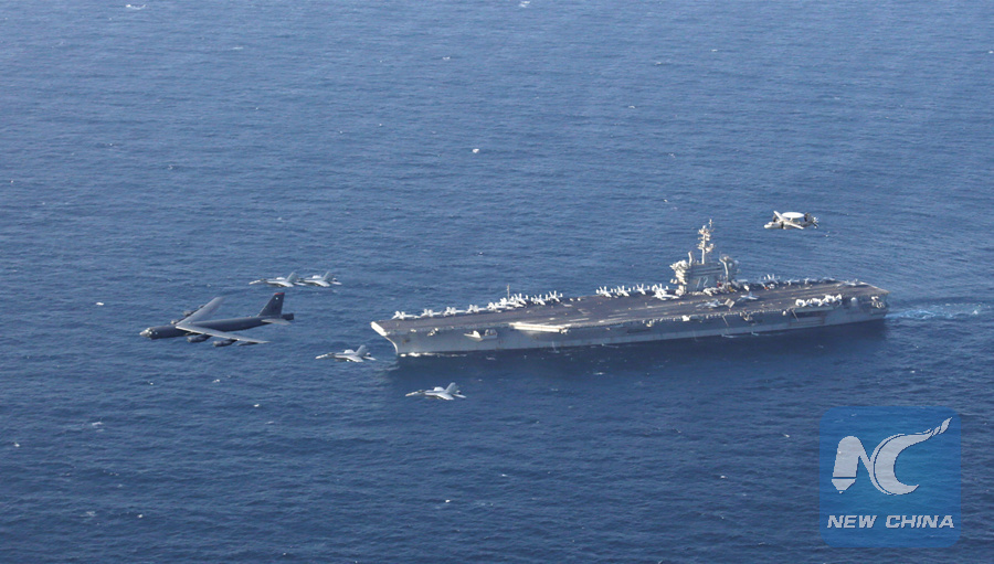 U.S. aircraft carrier Abraham Lincoln (CVN 72) and a U.S. Air Force B-52H Stratofortress, deployed to the region, conduct joint exercises in Arabian Sea, June 1, 2019. (Reuters)