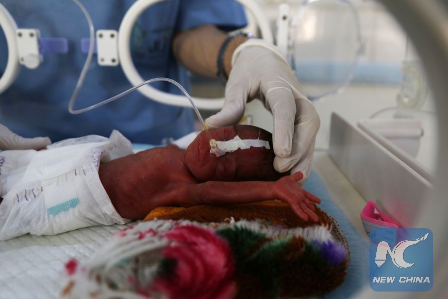 A doctor checks a prematurely-born baby in al-Sabeen hospital in Sanaa, Yemen, on June 11, 2019. Armed conflicts in Yemen have worsen the situation of women and children at birth. (Xinhua/Mohammed Mohammed)