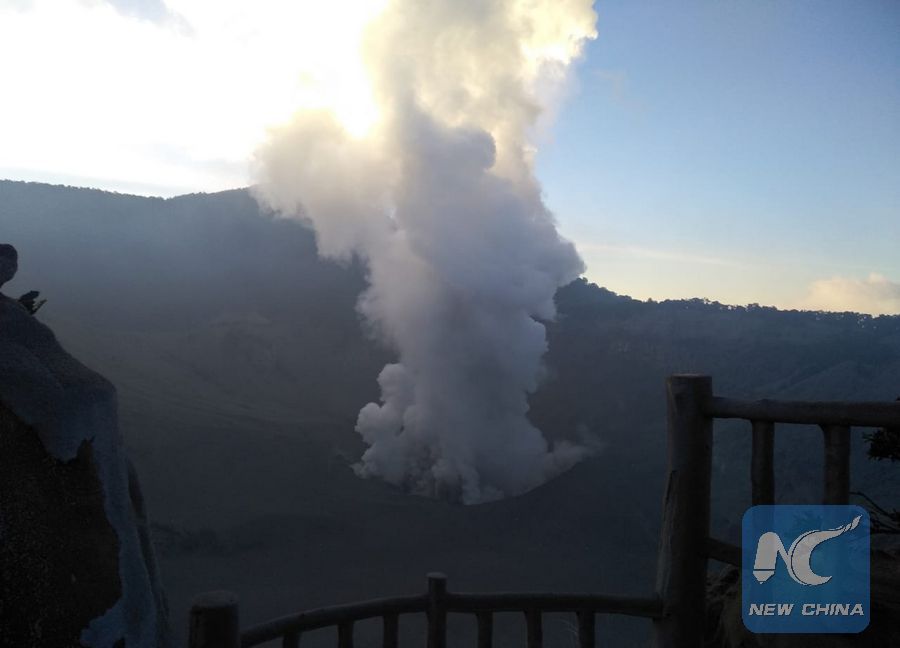 Thick smoke spewed from Mount Tangkuban Parahu is seen after the eruption in West Java, Indonesia, July 26, 2019. (Xinhua/HO-BNPB)