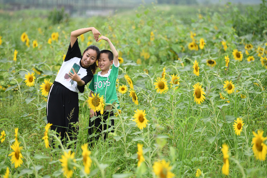 Tourists take selfies in Meiying Village of Sanjie Town in Mingguang, east China's Anhui Province. July 17, 2019. Sanjie Town develops rural tourism to boost rural development. (Xinhua/Liu Junxi)