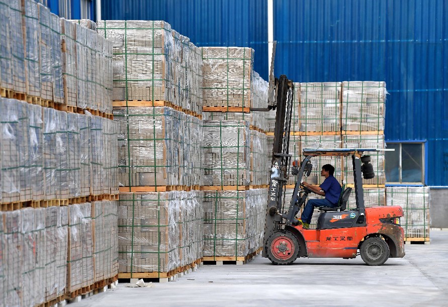 A worker forklifts permeable bricks at a factory of Jiangxi Longfa Industrial Company Ltd. in Xiangdong District of Pingxiang, east China's Jiangxi Province, May 29, 2019. (Xinhua/Peng Zhaozhi)