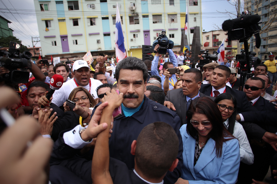 Venezuelan President Nicolas Maduro (C) attends a tribute to civilians killed in the US military action against Panama in the neighborhood of El Chorrillo, in Panama City, capital of Panama, April 10, 2015. (Xinhua/Mauricio Valenzuela)