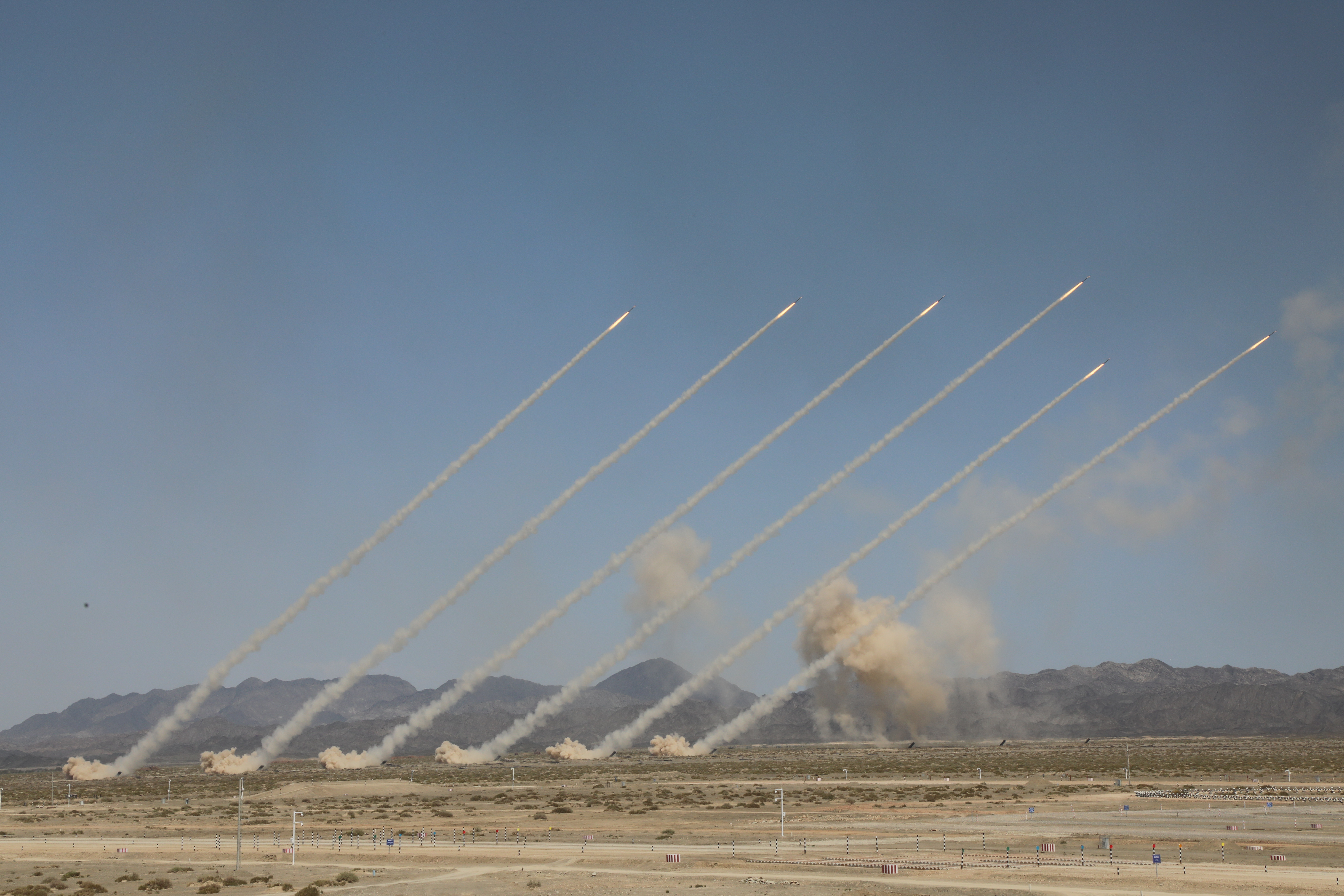 Rocket artilleries fire in a military presentation in Korla. (Photo by Wang Junqiang/Xinhua)