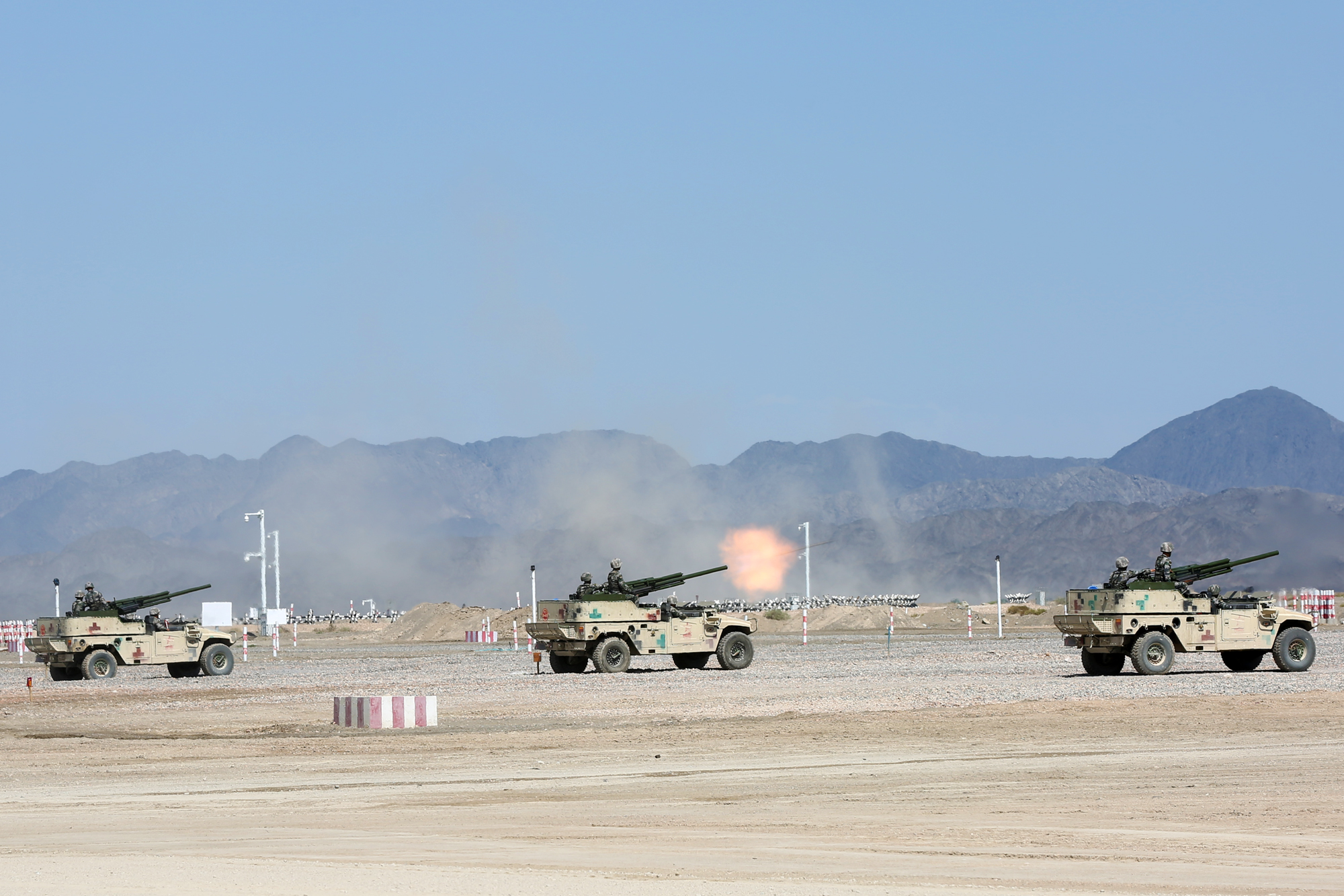 Vehicle-mounted mortars fire in a military presentation in Korla. (Photo by Zhao Zhiguo/Xinhua)
