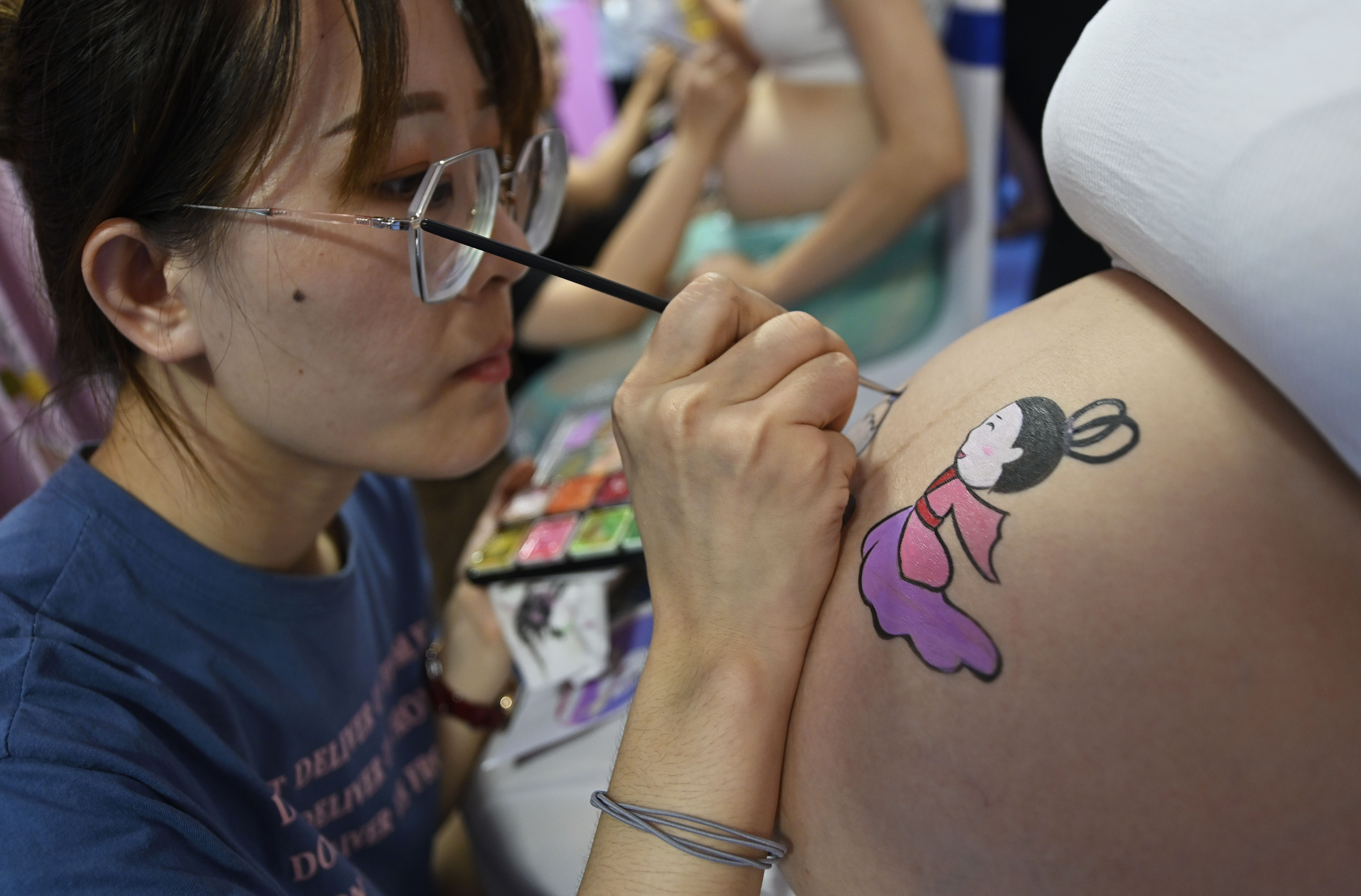 A pregnant woman has her belly painted during a belly fashion contest in Haikou, south China's Hainan Province, Aug. 4, 2019. (Xinhua/Guo Cheng)