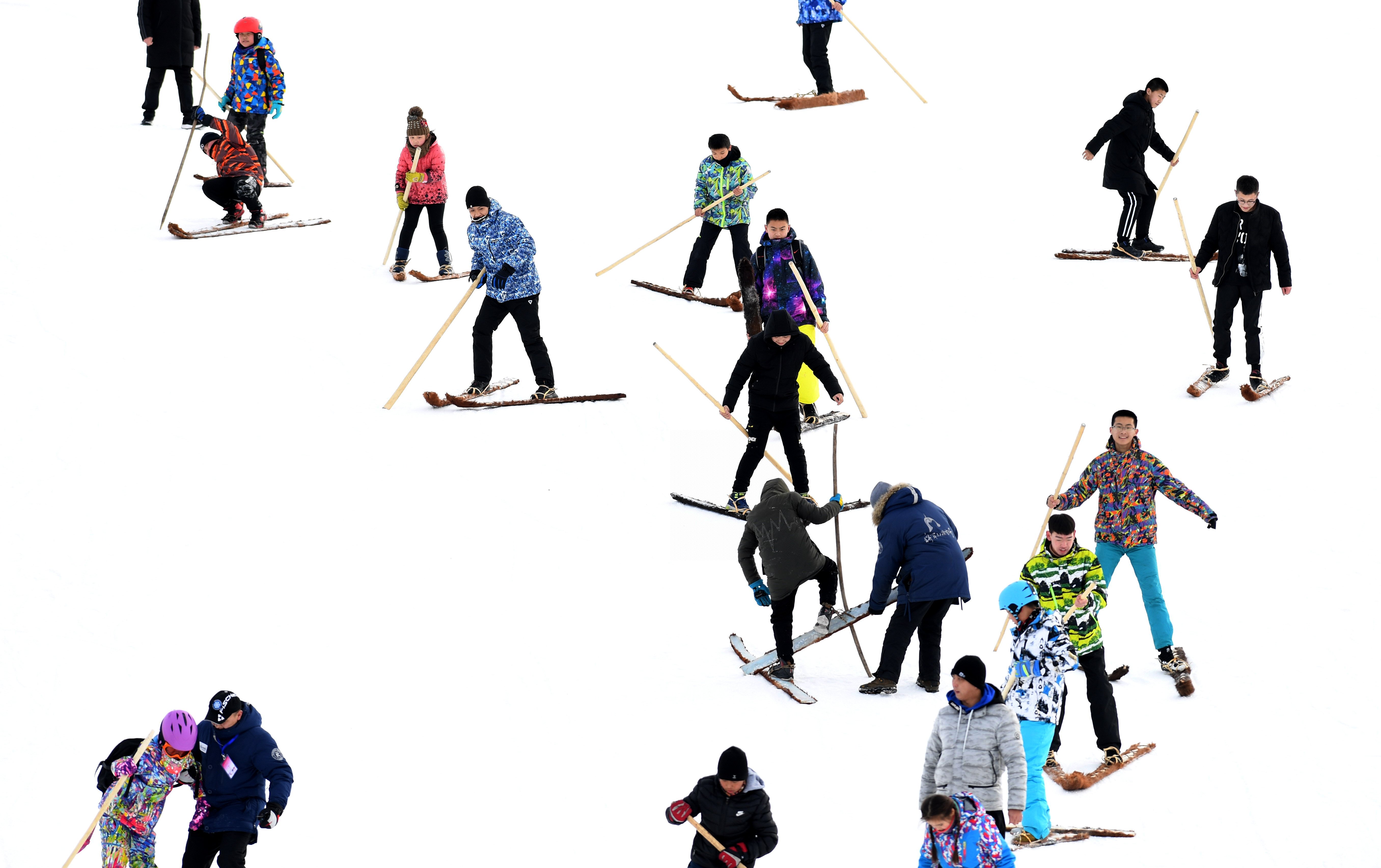 People skiing with fur snowboards during a celebration in Altay, northwest China's Xinjiang Uygur Autonomous Region, Jan. 16, 2019. (Xinhua/Sadat)