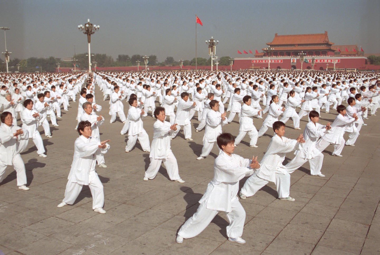 Some 10,000 peoples from Beijing, Yongnian County of northern Hebei Province and overseas Chinese from abroad take part in the Taijiquan performance at central Tiananmen Square in Beijing, capital of China, on Oct. 15, 1998. (Xinhua/Li Jundong)