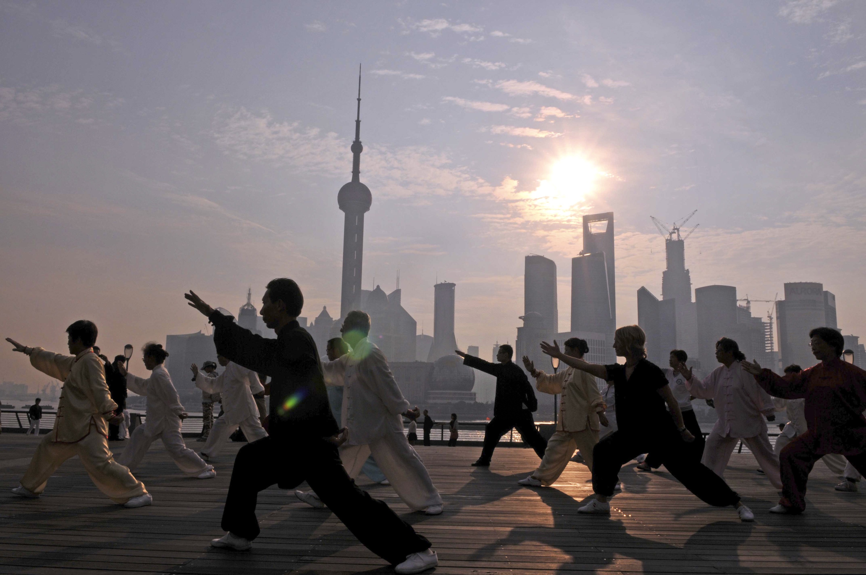 People practice Taiji, a Chinese martial art, on the Bund, east China's Shanghai Municipality, Oct. 3, 2012. (Xinhua/Pan Huaqing)
