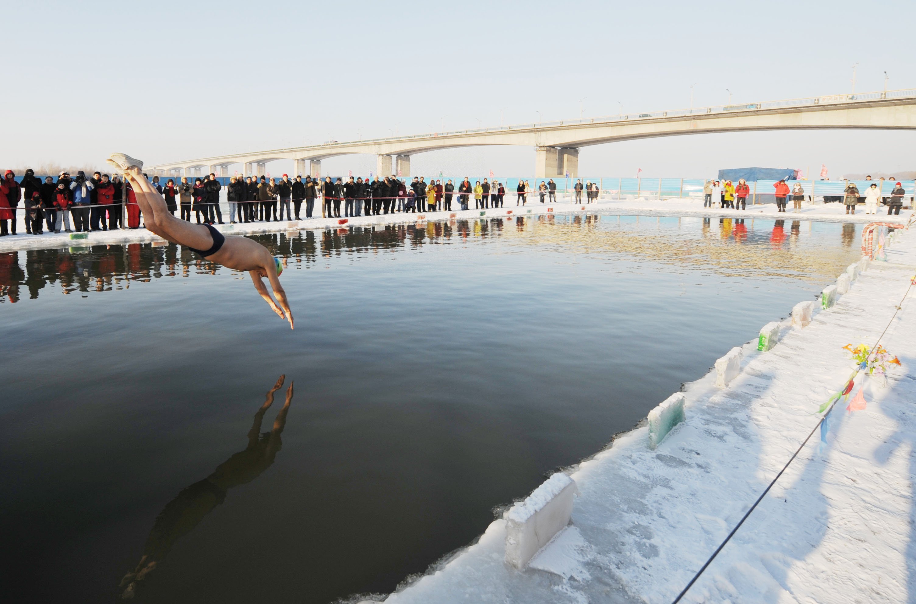 A winter swimmer dives into the pool carved up from the frozen Songhua river in Harbin, northeast China's Heilongjiang province, on Jan. 2, 2009. (Xinhua/Wang Jianwei)