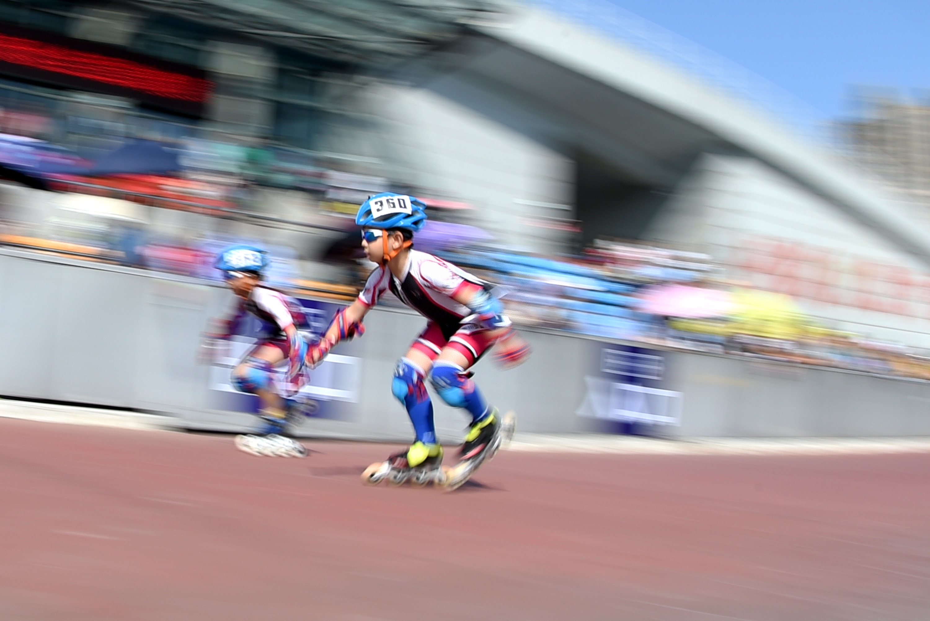 Sun Qizhou(R) from Hefei City competes during the 2018 speed roller skating competition for boys in Hefei, east China's Anhui Province, on Oct. 4, 2018. (Xinhua/Guo Chen)