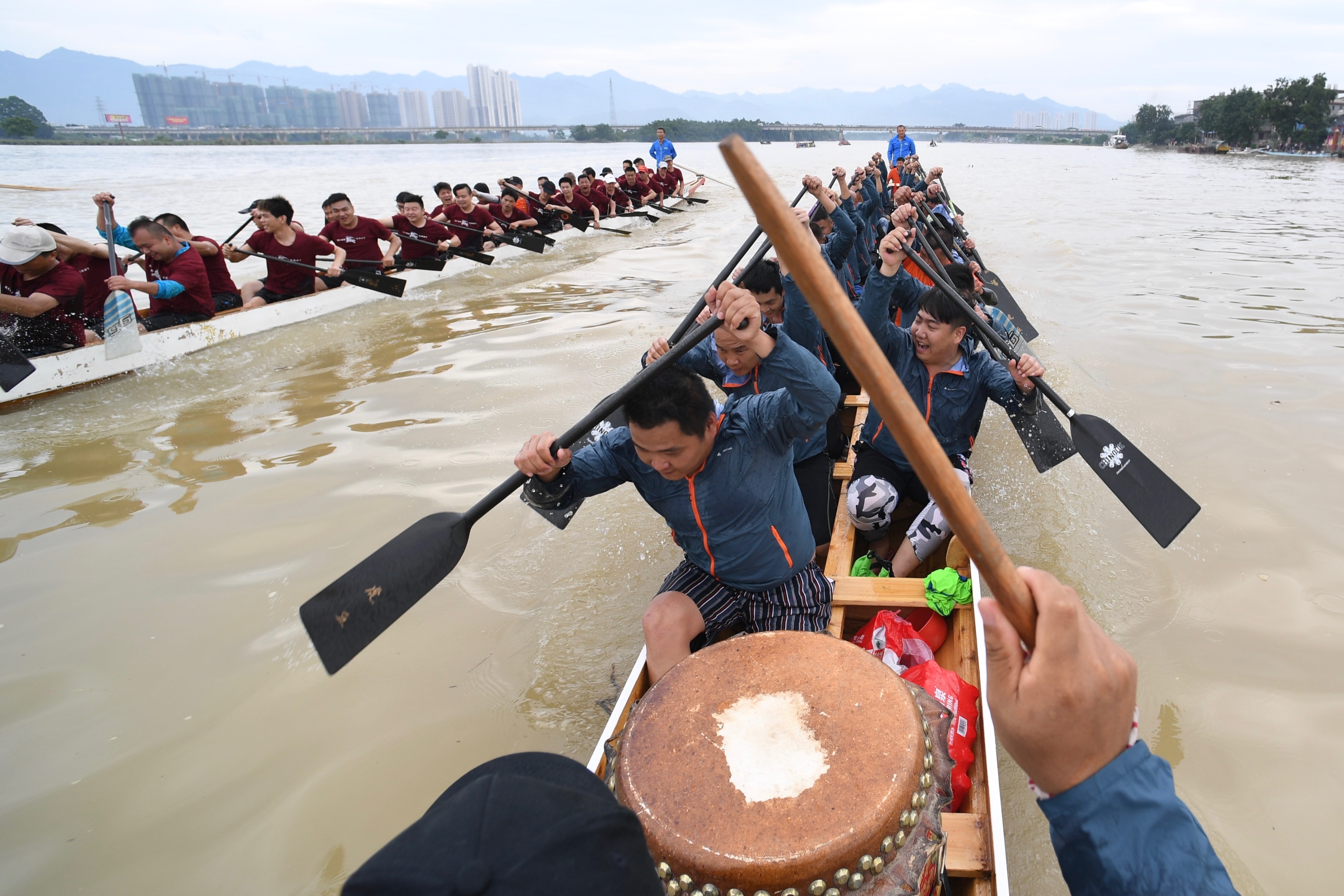 People take part in a dragon boat race to celebrate the Dragon Boat Festival in the Dazhangxi River at Nanqian Village, Minhou County of Fuzhou City, southeast China's Fujian Province, on June 6, 2019. (Xinhua/Jiang Kehong)