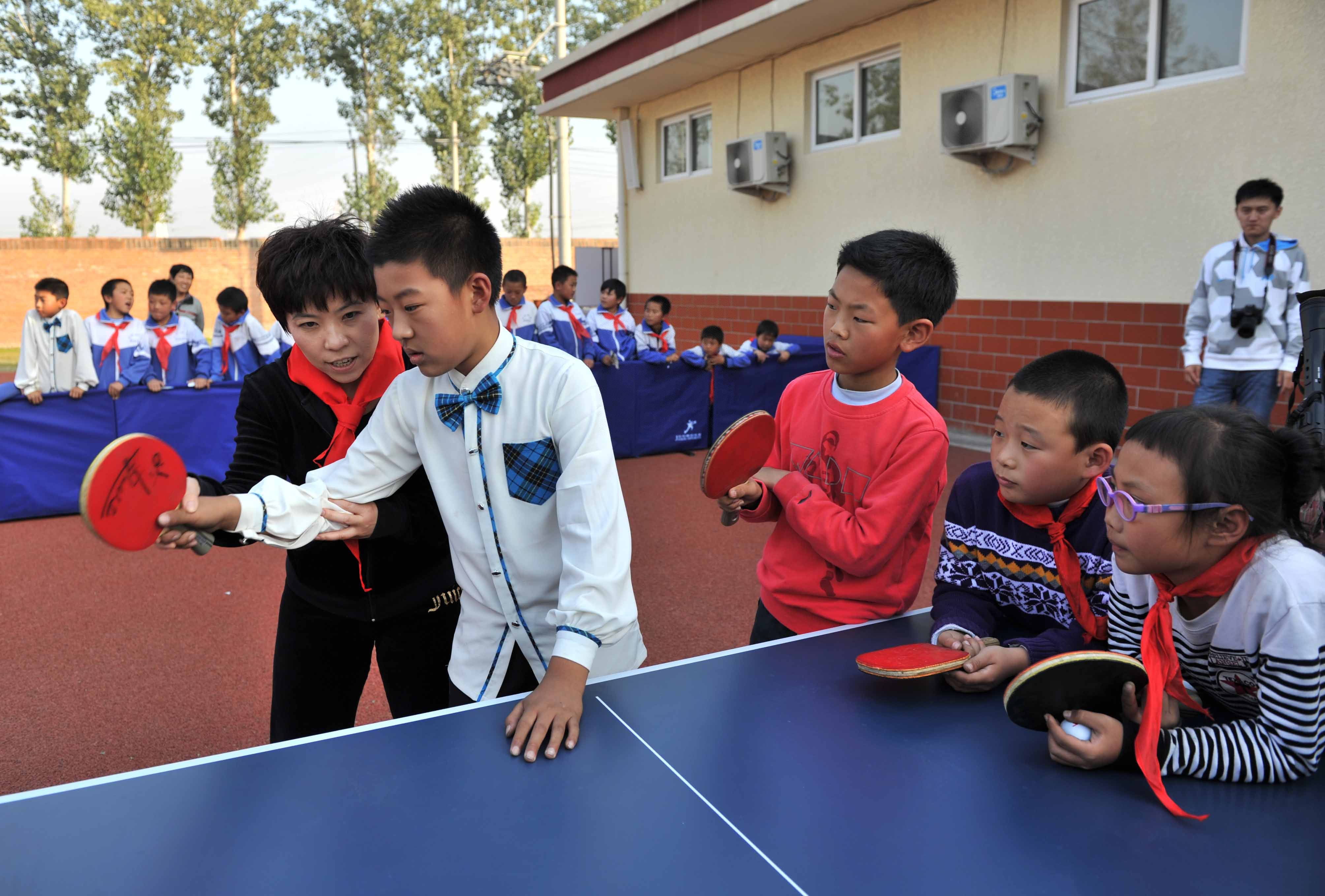 Deng Yaping(1st L) instructs students of Huangchenggen primary school to play table tennis in Beijing, capital of China, on Oct. 17, 2014. (Xinhua/Li Wen)