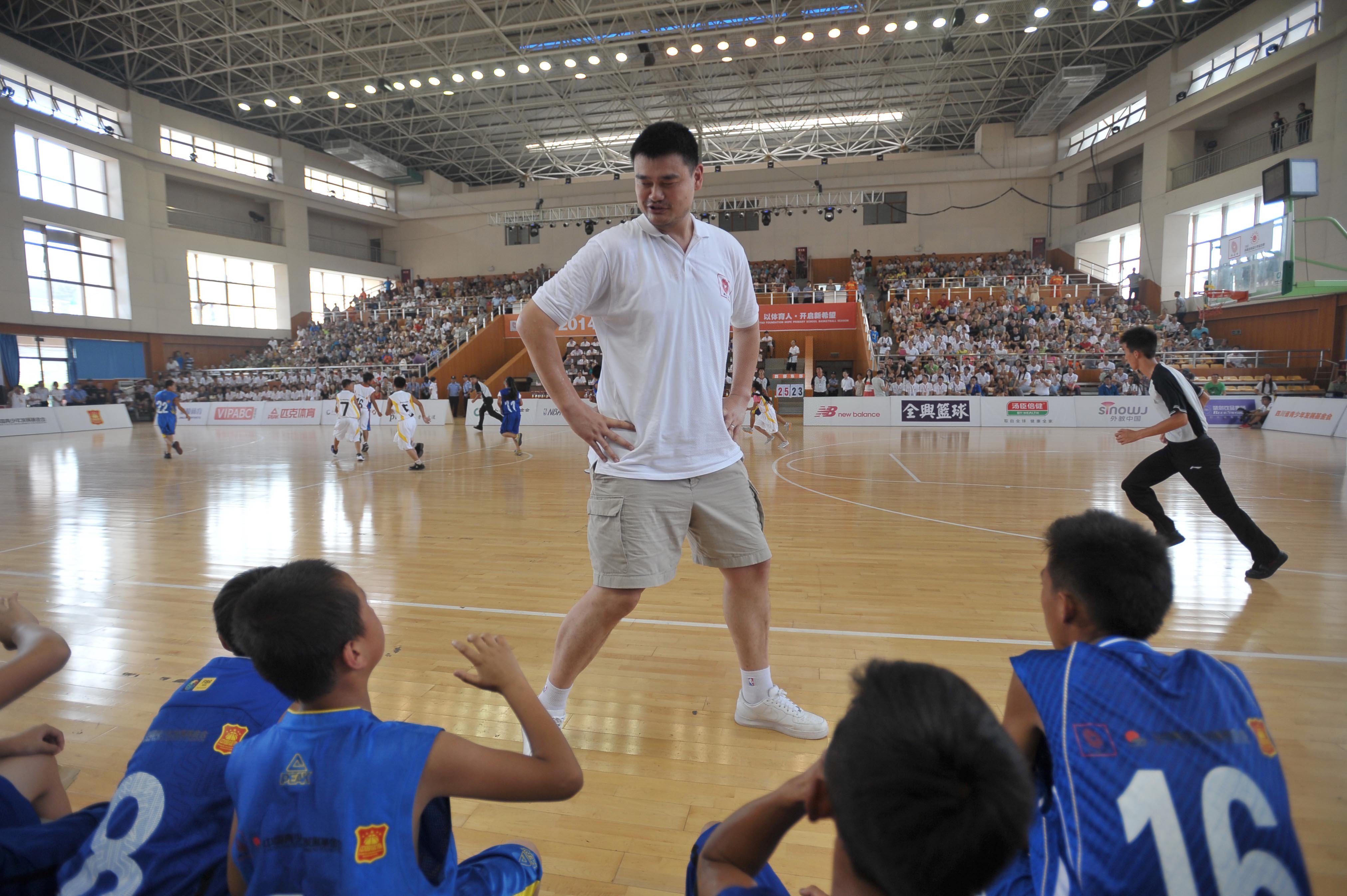 Yao Ming(C) talks to young players during the last exhibition game of the Yao Foundation basketball season in Beichuan County of Mianyang City, southwest China's Sichuan Province,on July 16, 2014. (Xinhua/Xue Yubin)