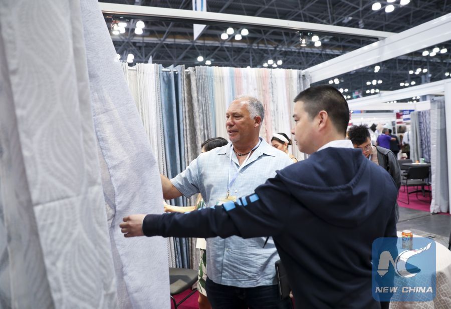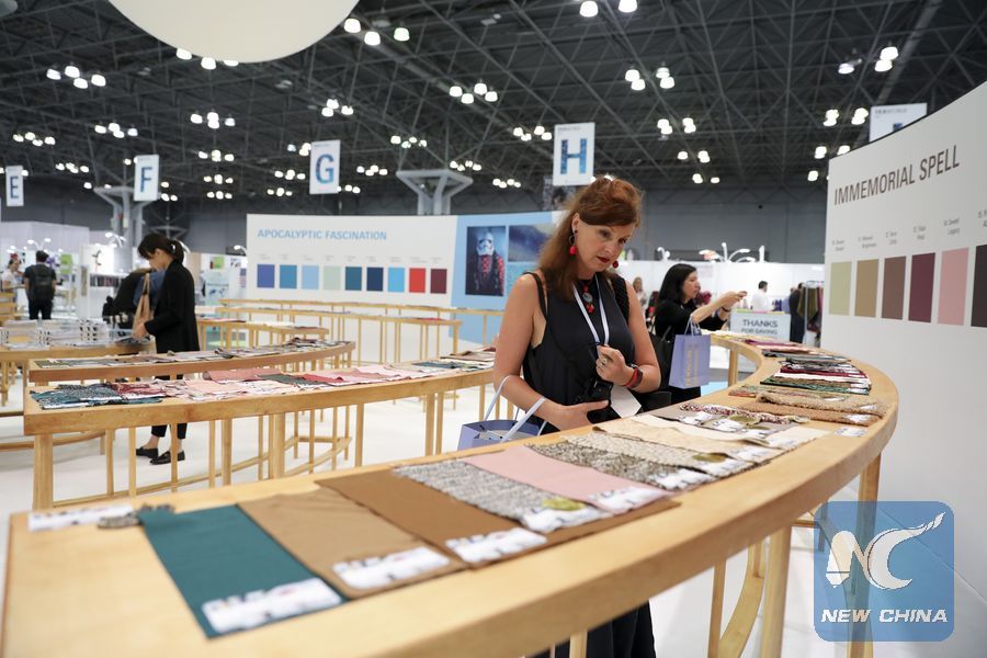 Visitors look at exhibits during the 20th China Textile and Apparel Trade Show in New York, the United States, July 22, 2019. (Xinhua/Wang Ying)
