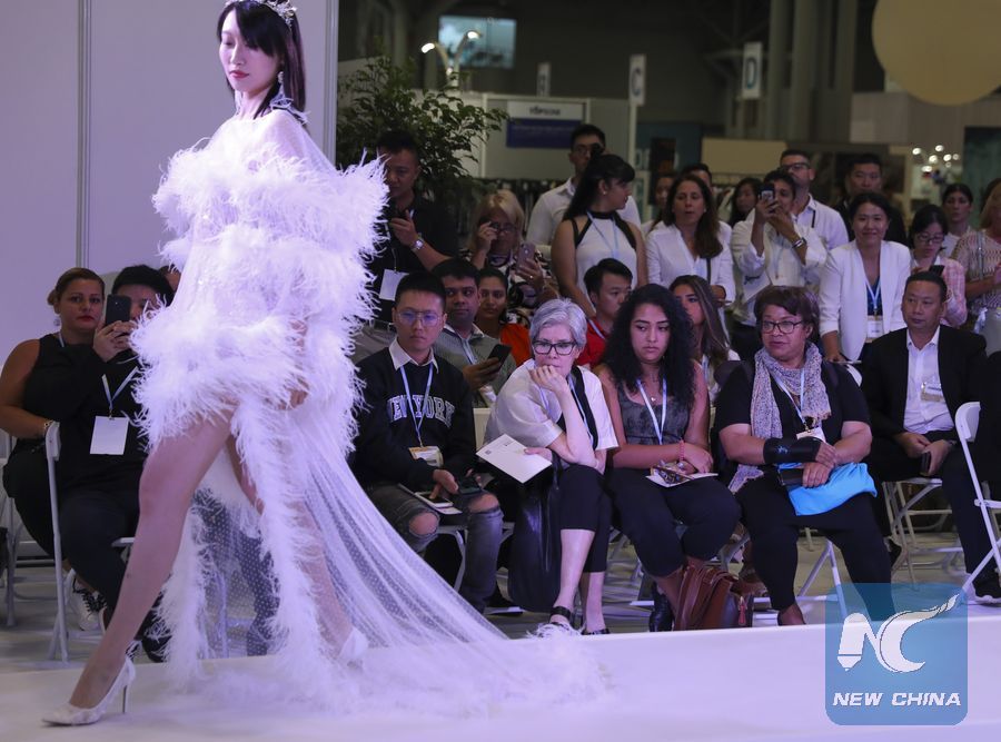 Models present creations of a Chinese company during the 20th China Textile and Apparel Trade Show in New York, the United States, July 22, 2019. (Xinhua/Wang Ying)