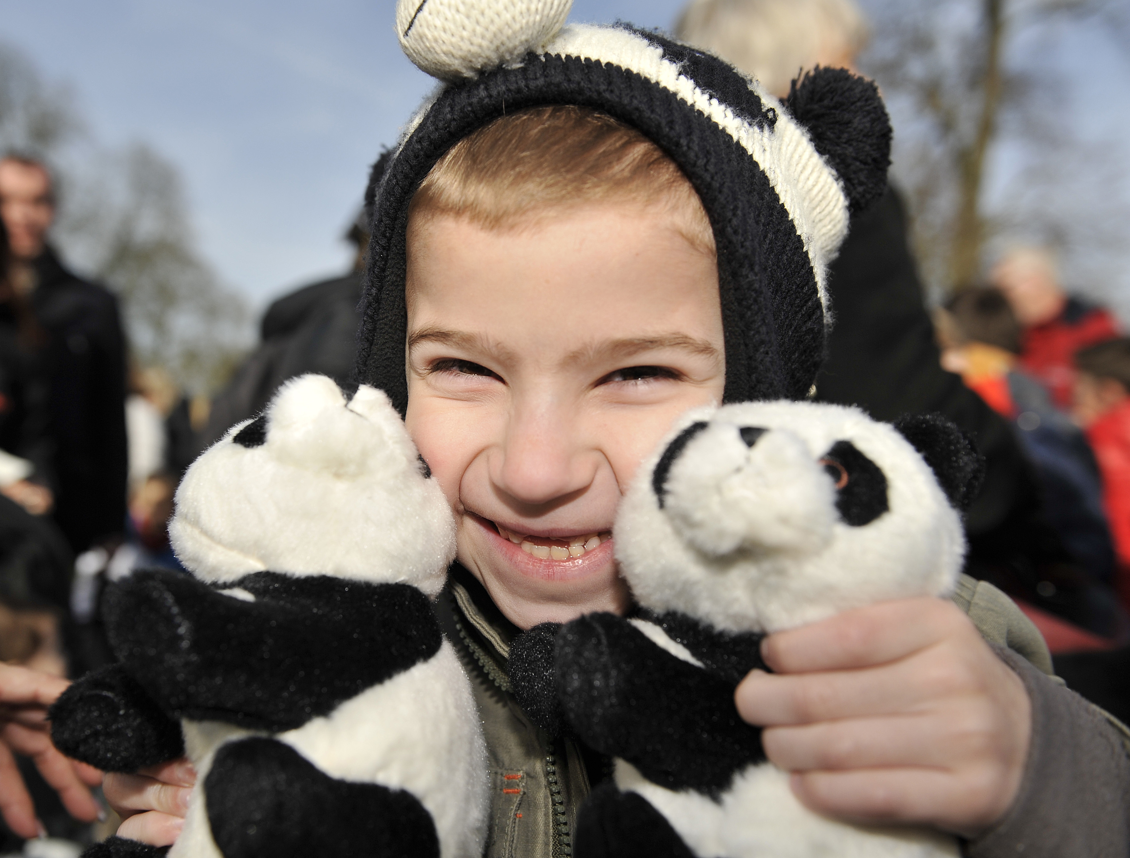 A boy with panda-shaped hat held two panda toys when waiting for the arrival of giant pandas, Hao Hao and Xing Hui, at Pairi Daiza Zoo, about 60 km southwest of Brussels on Feb. 23, 2014.(Xinhua photo)