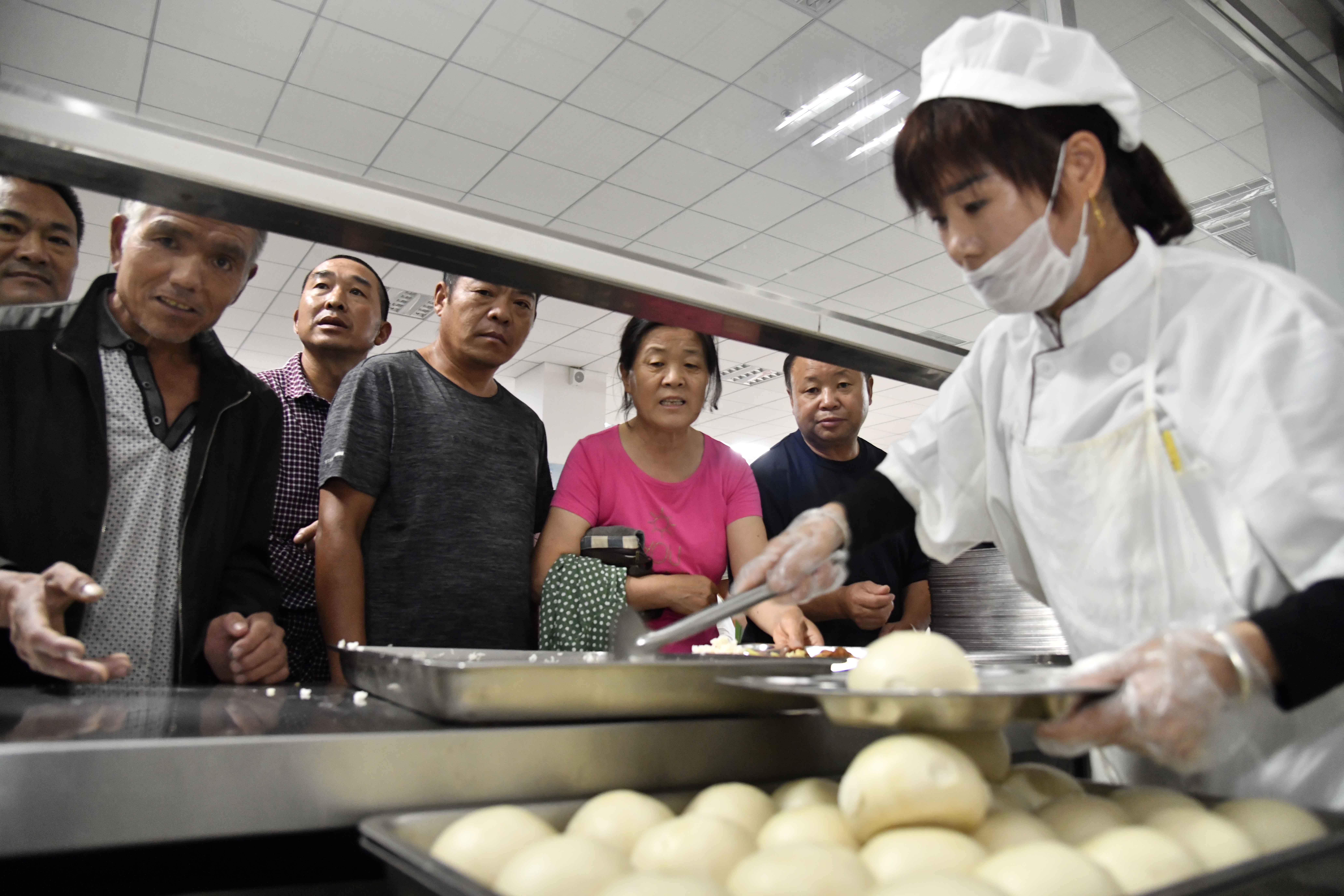 People get meals at a middle school, which now serves as a relocation site, in Shouguang, E China's Shandong Province. (Xinhua/Guo Xulei)
