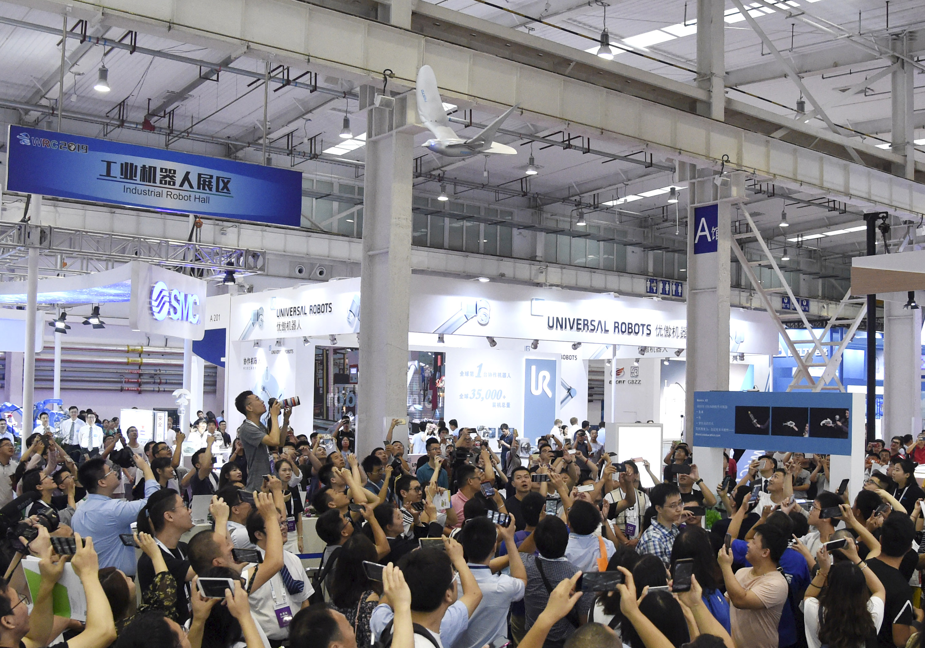 People take photos of a robotic bird during the 2019 World Robot Conference in Daxing District of Beijing. (Xinhua/Ren Chao)