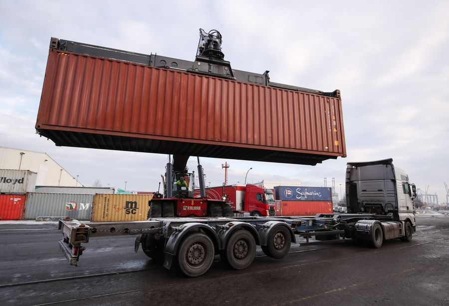A container is lifted onto a truck at the warehouse of German packaging and logistics company EPOLOG in Hamburg, Germany, on Jan. 21, 2019. (Xinhua/Shan Yuqi)