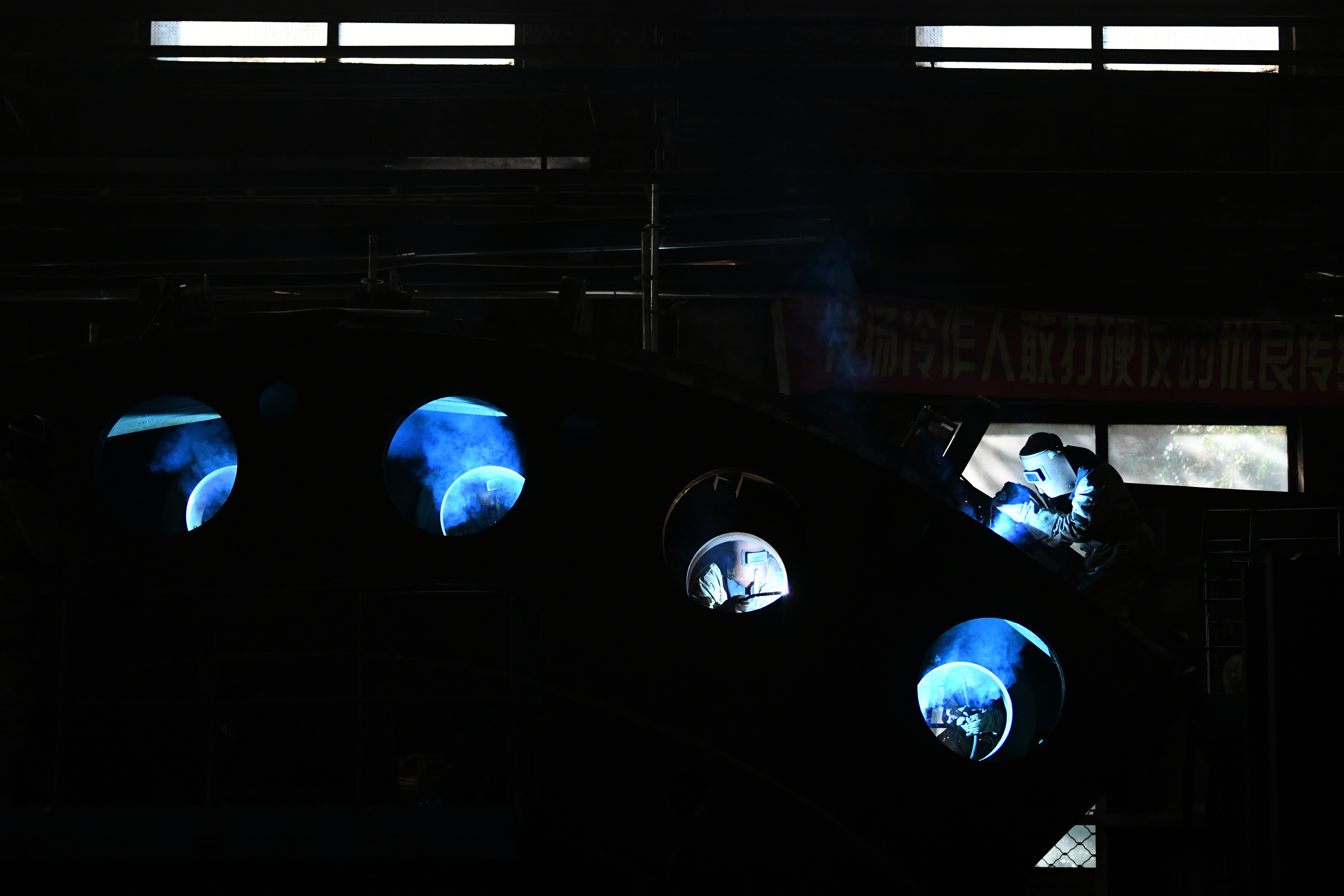 A worker is seen at a boiler production factory of Harbin Boiler Company Limited in Harbin, Sept. 4, 2019. (Xinhua/Wang Jianwei)