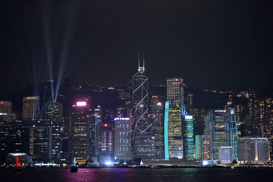 A light show is on at Victoria Harbour in Hong Kong, south China, Dec. 1, 2017. (Xinhua/Wang Xi)