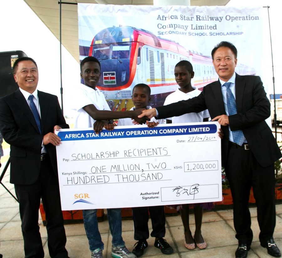 Li Jiuping (R), General Manager of Africa Star presents a cheque to local students during the award ceremony for the scholarship for bright but needy Kenyan high school students, in Nairobi, capital of Kenya, April 27, 2019. The Chinese operator of the Standard Gauge Railway (SGR) aims to help disadvantaged Kenyan students pursue career dreams. (Xinhua/Charles Onyango)