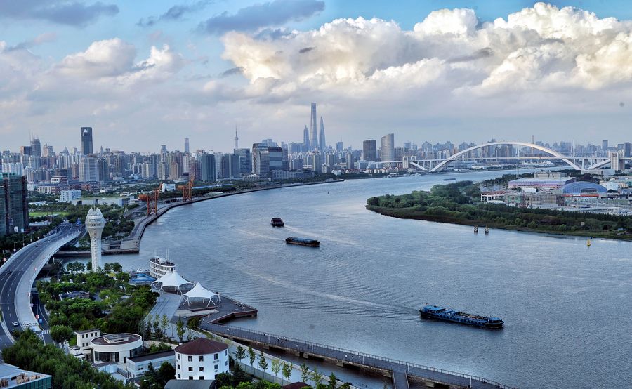 Photo taken on Sept. 8, 2015 shows an aerial view of one section of Huangpu River in east China's Shanghai Municipality. (Xinhua/Cheng Zixie)