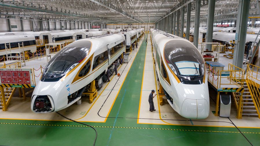 Tang Jiankun (1st R), a staff member of CRRC Changchun Railway Vehicles Co., Ltd. checks a Fuxing bullet train at a manufacturing center in Changchun, northeast China's Jilin Province, June 20, 2019. (Xinhua/Zhang Nan)