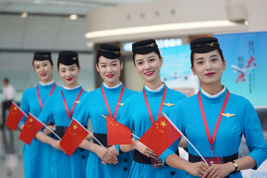 Staff members of Xiamen Airlines greet passengers at the terminal of Daxing International Airport in Beijing, capital of China, Sept. 25, 2019. (Xinhua/Ju Huanzong)