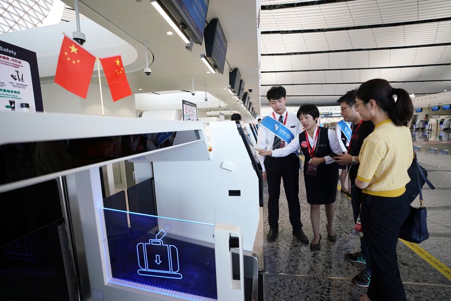 Staff members of China Southern Airlines help with the self-service baggage check counter at the terminal of Daxing International Airport in Beijing, capital of China, Sept. 25, 2019. (Xinhua/Ju Huanzong)