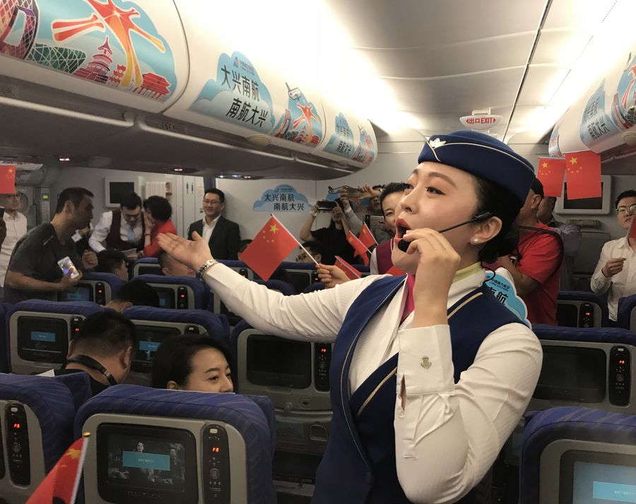 A flight attendant sings a song inside the China Southern Airlines flight CZ3001 on Sept. 25, 2019. (Xinhua/Tai Sicong)