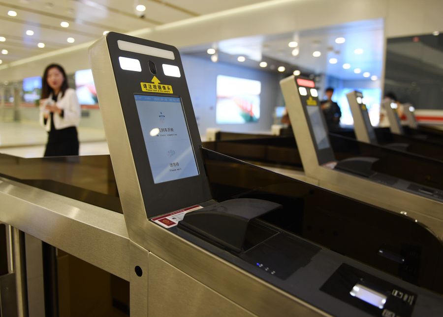 Photo taken on Sept. 20, 2019 shows face recognition technology-supported check-in facility at Daxing Airport Railway Station of the Beijing-Xiongan intercity railway in Beijing, capital of China. (Xinhua/Zhang Chenlin)