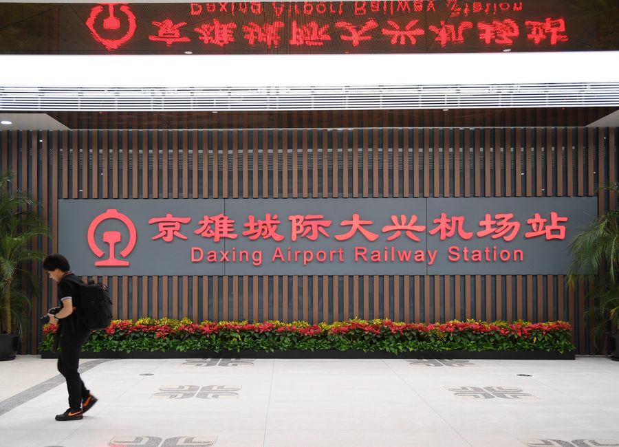 A Fuxing (Rejuvenation) bullet train pulls in the Daxing Airport Railway Station of the Beijing-Xiongan intercity railway during a test run in Beijing, capital of China, Sept. 20, 2019. (Xinhua/Zhang Chenlin)