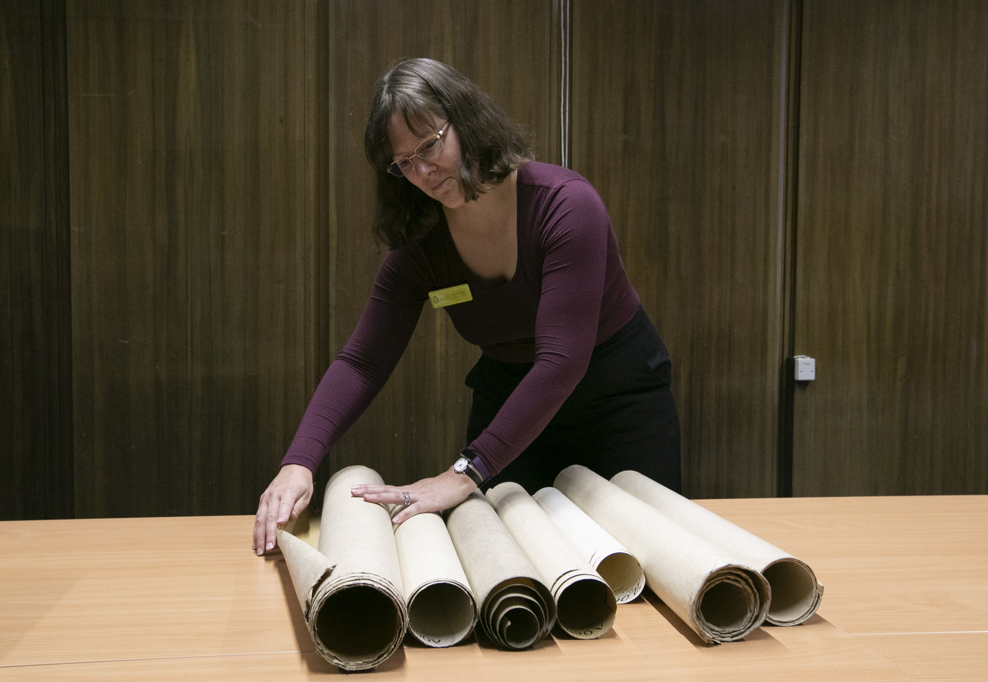 Rachel Gill, an archivist, introduces the plans of Zhiyuan, one of the most renowned and heroic military vessel in Chinese history, at the Tyne & Wear Archives in Newcastle, Britain, Nov. 2, 2018. (Xinhua/Han Yan)