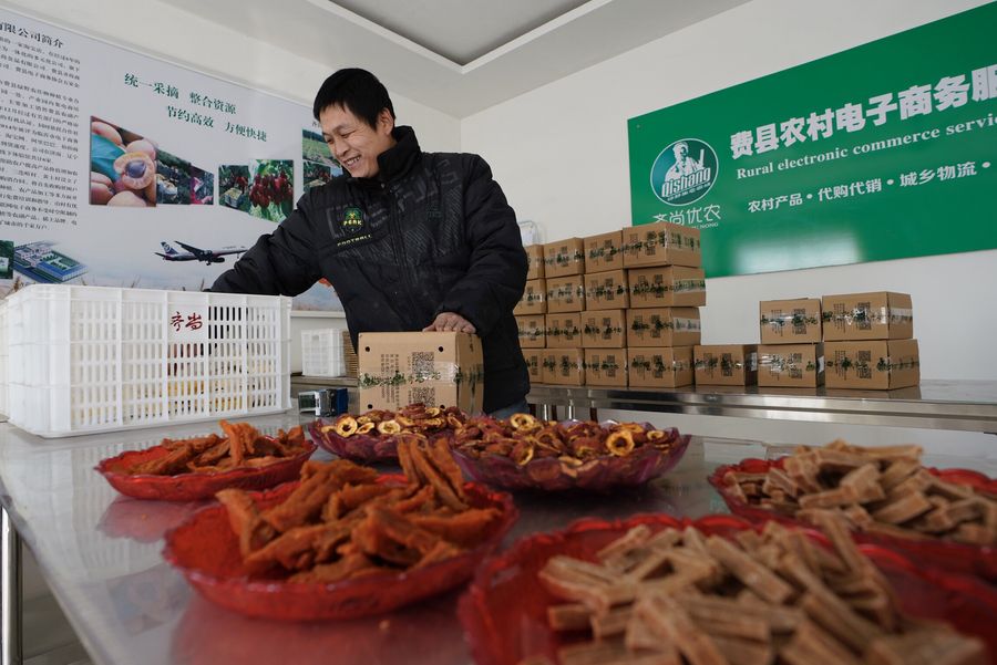 A villager Wang Yiping distributes goods through e-commerce platforms in Datianzhuang Village of Feixian County, east China's Shangdong Province, Jan. 23, 2018. (Xinhua/Xing Guangli)