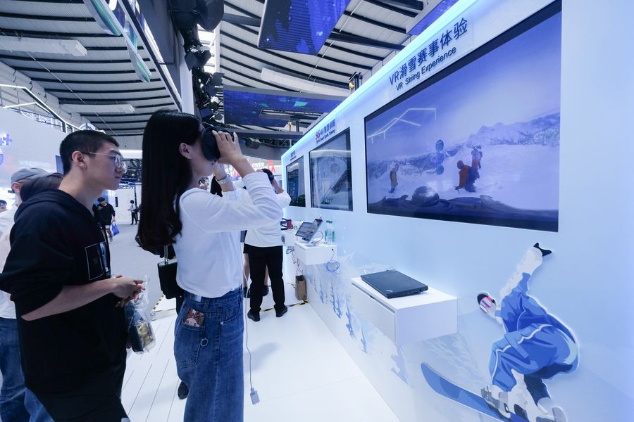 A visitor tries virtual skiing via a VR device at the Light of the Internet Expo Center in Wuzhen, east China's Zhejiang Province, Oct. 19, 2019. Under the theme of "Smart, connectivity, openness and cooperation: jointly build a community of shared future in cyberspace," the 6th World Internet Conference (WIC) will be held from Oct. 20 to 22 in Wuzhen. (Xinhua/Xu Yu)