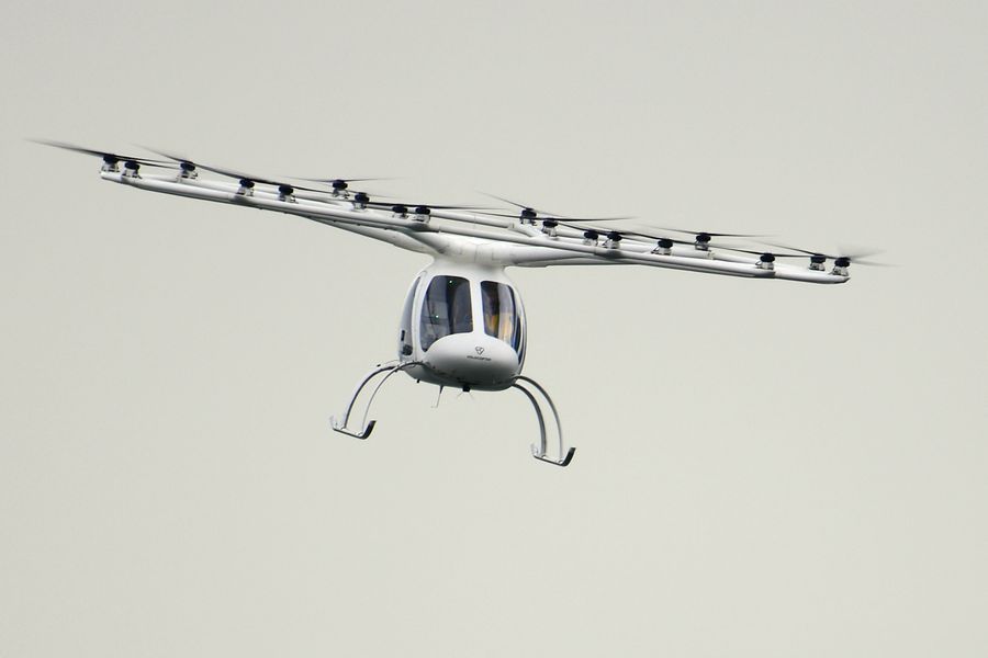 A Volocopter air taxi flies over Marina Bay in an urban test flight during the 26th Intelligent Transport Systems (ITS) World Congress in Singapore, on Oct 22, 2019. (Xinhua/Then Chih Wey)■