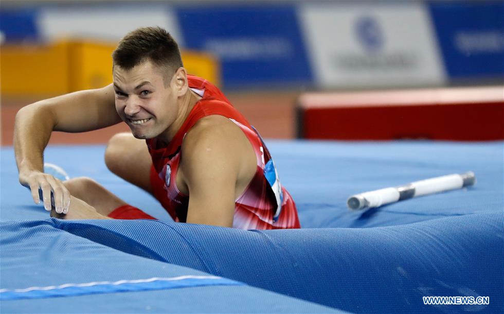 Pawel Wojciechowski of Poland gets injured due to his broken pole at his first attempt of 5.82m height during the men's pole vault final of track and field at the 7th CISM Military World Games in Wuhan, capital of central China's Hubei Province, Oct. 24, 2019. (Xinhua/Wang Lili)