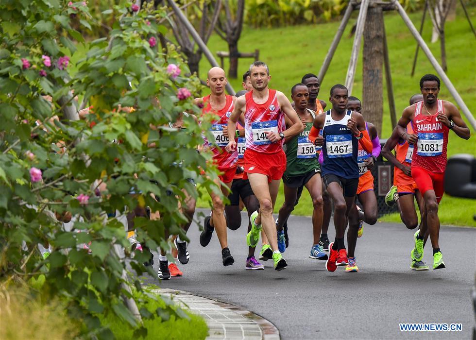 Athletes compete during the men's marathon individual final of track and field at the 7th CISM Military World Games in Wuhan, capital of central China's Hubei Province, Oct. 27, 2019. (Xinhua/Hu Huhu)