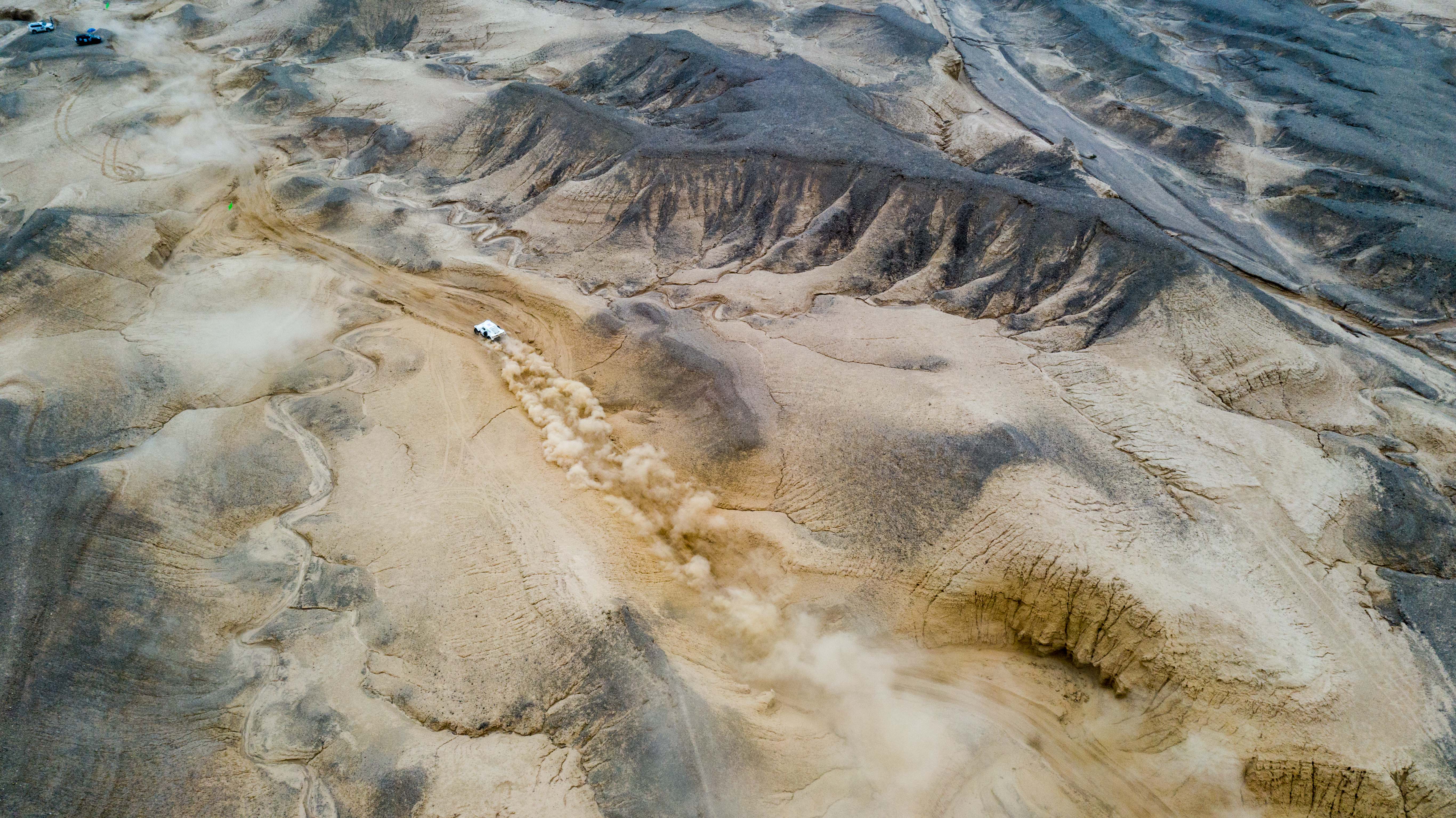 Aerial photo taken on May 20, 2019 shows a racing car running on riverbed during the 2019 Taklimakan Rally in Aksu, northwest China's Xinjiang Uygur Autonomous Region. (Xinhua/Jiang Wenyao)