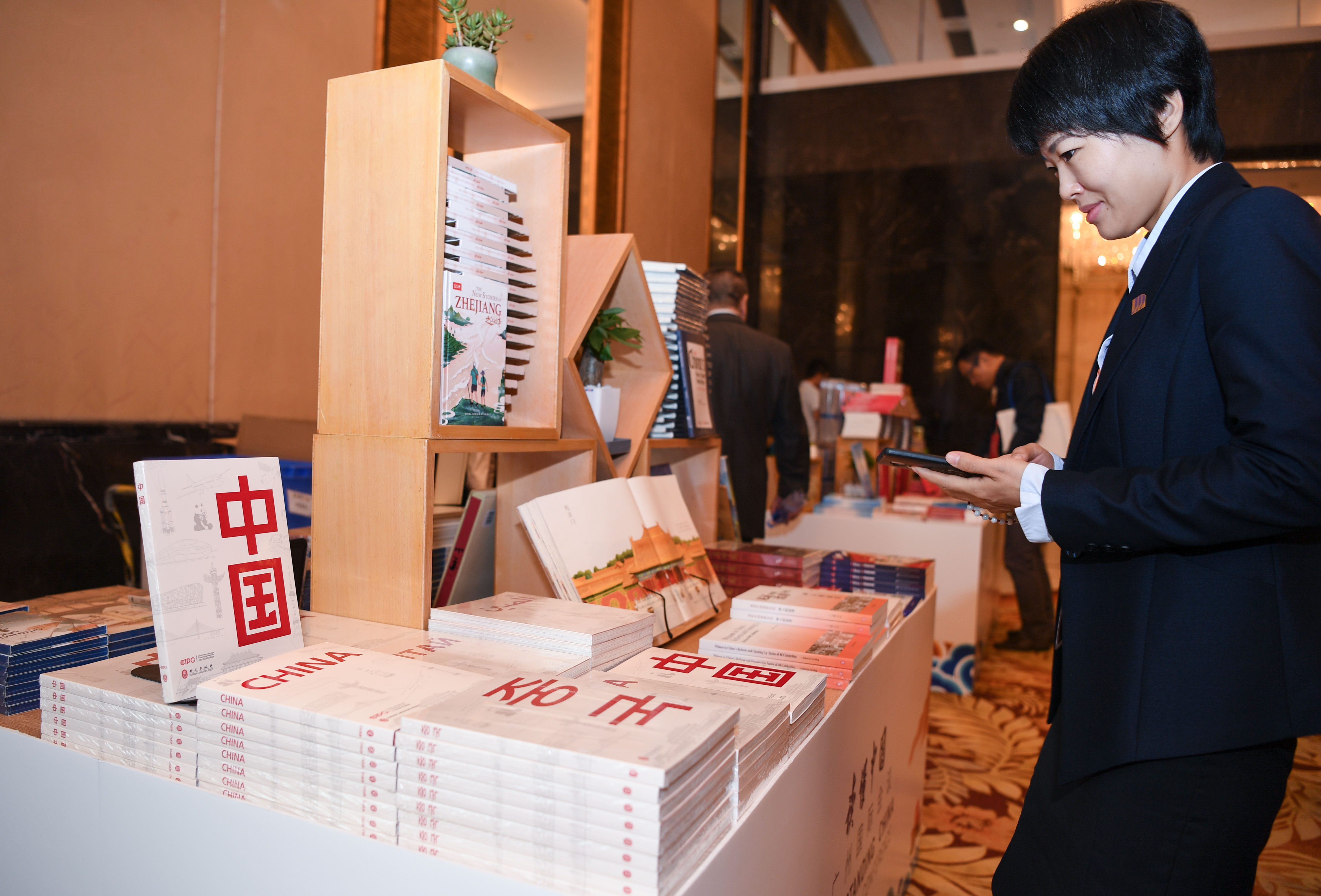 A participant stands in front of books on display during the Understanding China Conference in Guangzhou, capital of south China's Guangdong Province, Oct. 26, 2019. (Xinhua/Deng Hua)