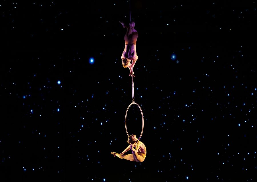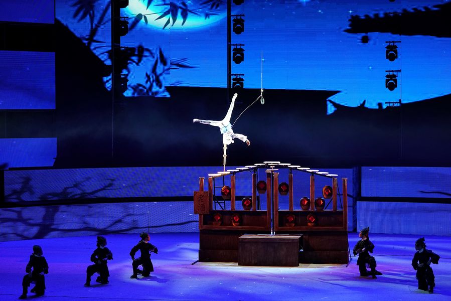 Acrobats perform during the 17th China Wuqiao International Circus Festival at Hebei provincial arts center in Shijiazhuang, capital of north China's Hebei Province, Oct. 28, 2019. (Xinhua/Mu Yu)
