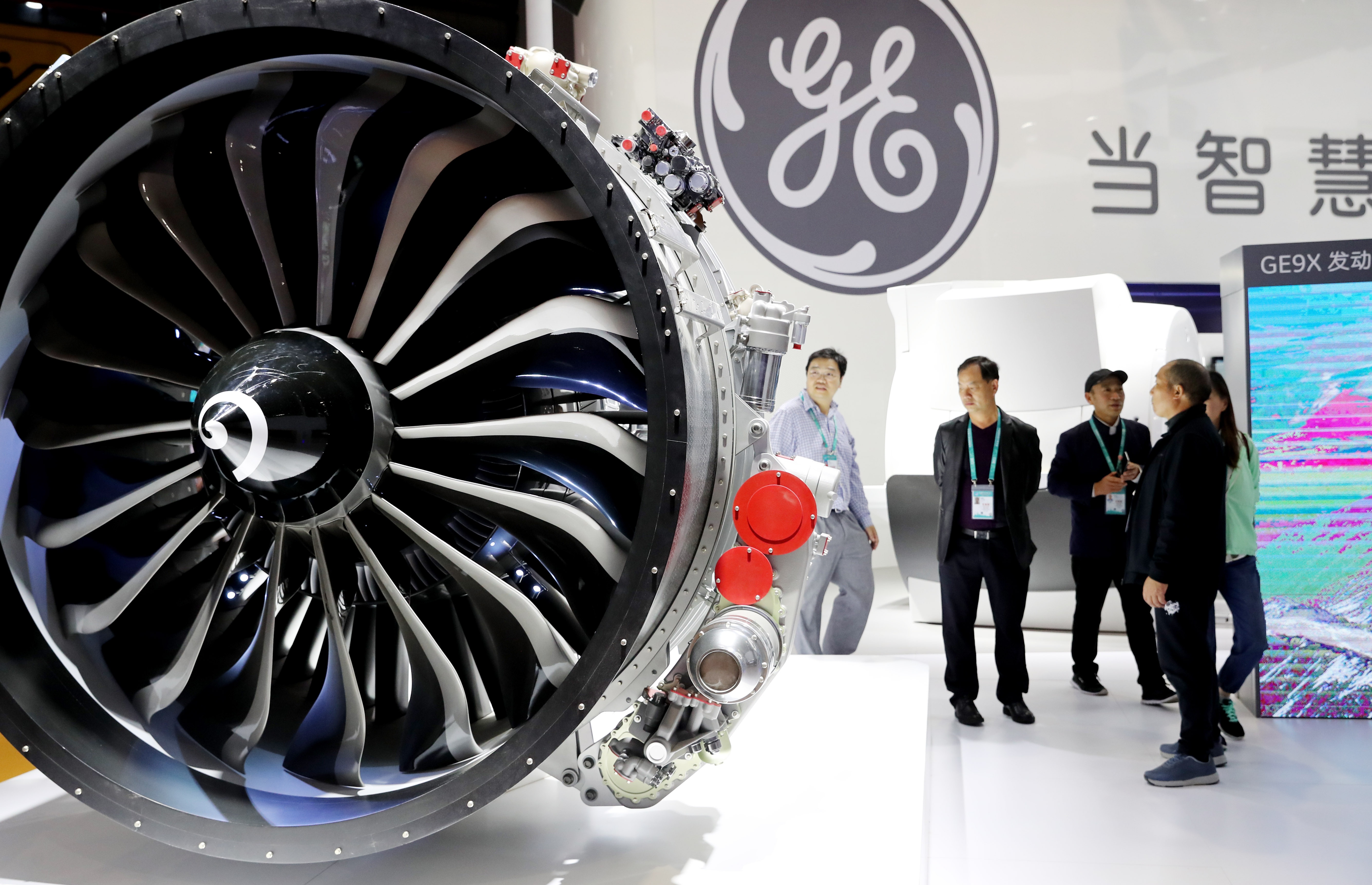 Visitors look at a model of GE's aircraft engine displayed at the first China International Import Expo in Shanghai, east China, Nov. 5, 2018. (Xinhua/Fang Zhe)