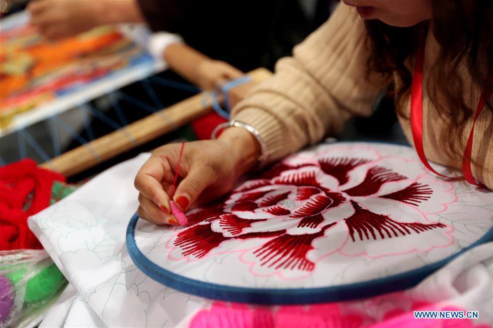 A craftswoman from northwest China's Qinghai Province shows embroidery at Shanghai International Hobby&Craft Expo in east China's Shanghai, Nov. 29, 2019. The three-day Shanghai International Hobby&Craft Expo kicked off here on Friday. (Xinhua/Liu Ying)